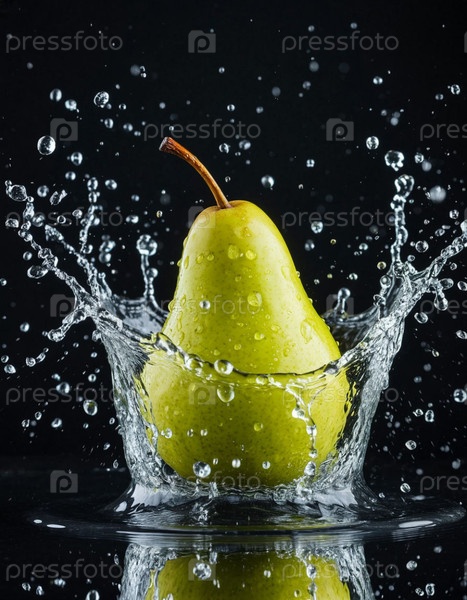 Груша в брызге воды на темном фоне