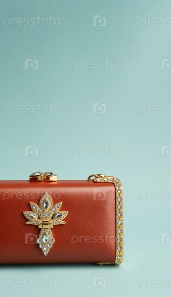 Женское кожаное сцепление с декорациями на пастельно-синем фоне
