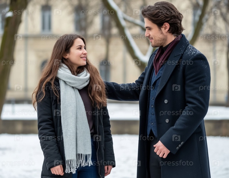 Романтическая пара, влюбленная зимой на улице - мужчина в стильном пальто и девушка в простом платье и шарфе. Различный социальный статус - богатые и бедные. Генерация ИИ