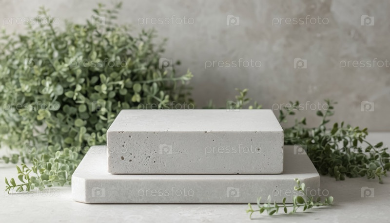 Белый мраморный подиум для презентации продукта на светлом фоне с мягкой зеленью на пастельном фоне