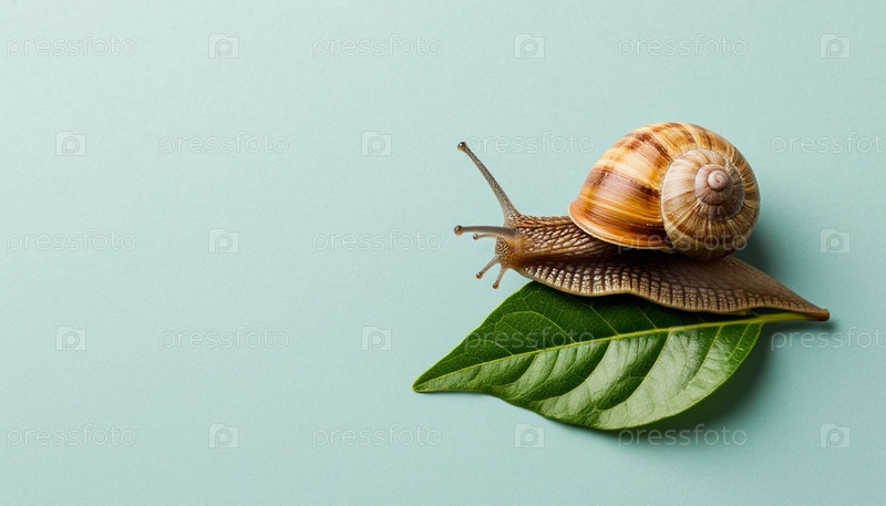 улитка на листочке травы на пастельно-серо-синем вертикальном фоне. генерируя AI
