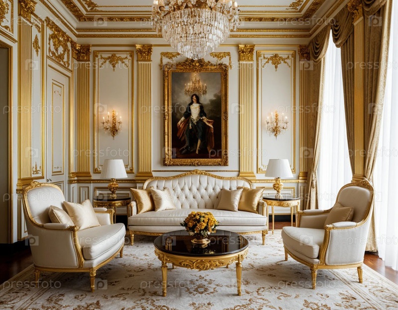 Роскошный дорогой интерьер с белыми и золотыми элементами