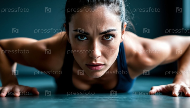 Сосредоточенная женщина делает упражнения на отжимания в тренажерном зале