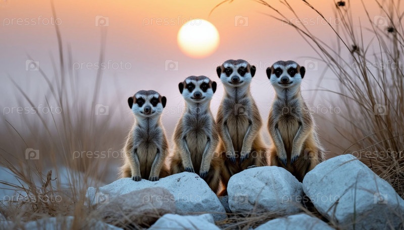 Меркаты смотрят из скал в степи на рассвете