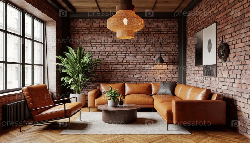 Современный интерьер гостиной с кожаным диваном