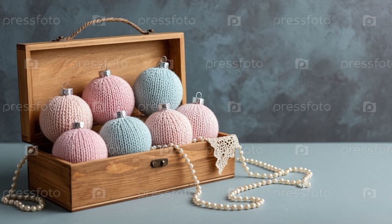 Пастельные вязаные шерстяные рождественские шары в стиле винтажного деревянного ящика. экологически чистые игрушки