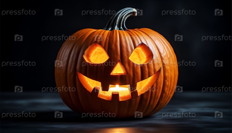 Тыква с блестящей резьбой в лице на черном фоне