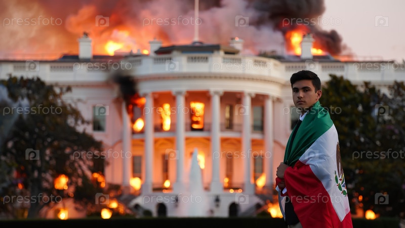 Парень с мексиканским флагом перед горящим Белым домом