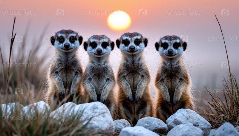 Меркаты смотрят из скал в степи на рассвете
