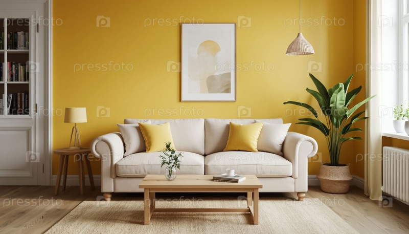 Желтый интерьер комнаты с диваном и планировкой для покраски