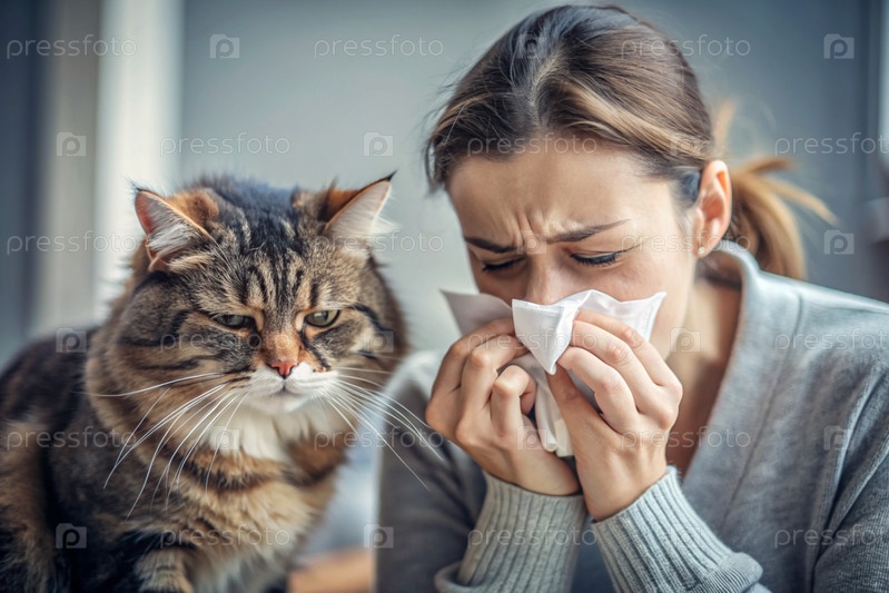 Женщина чихает в белую салфетку дома. Аллергия на волосы кошек и домашних животных. Рядом со мной кот