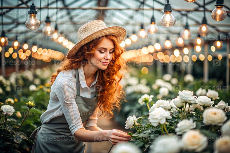 Портрет красивого садовника с рыжими волосами в соломенной шляпе, работающего с розами в стеклянной теплице
