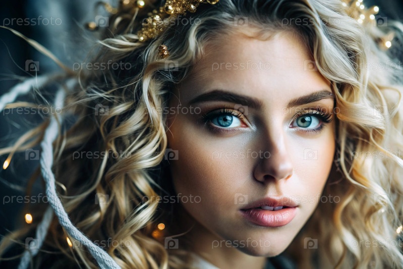 Глубокий эмоциональный портрет.Лицо молодой девушки без макияжа с выразительными глазами и блондинскими кудрявыми волосами.Естественная женская красота