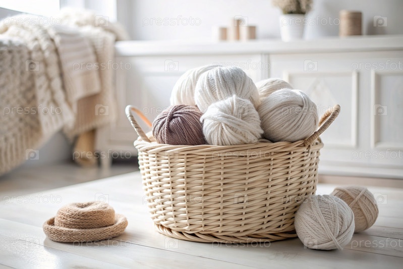 шарики пряжи в корзине из плесеня в белых и бежевых тонах швейная работа, текстиль, вязание зимний сезон, малый бизнес, ручная одежда