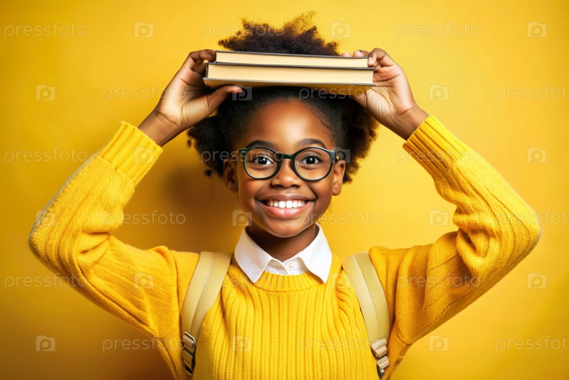 Красивая афроамериканская девушка с очками и книгами. Ребенок впервые ходит в школу. Ребёнок на желтом монохромном фоне