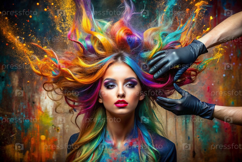 Творческий баннер для салона красоты или парикмахера. Модное профессиональное окрашивание волос. Красивая женщина с длинными многоцветными волосами. Взрыв цветов на голове
