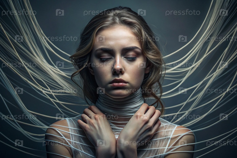 Девочка завернута в целлофан или сумку. Девушка задыхается. Пластиковое загрязнение планеты. Опасность для окружающей среды. Сокращение повторного использования пластика. Переработка. Концепция мусора