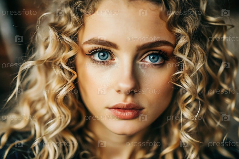 Глубокий эмоциональный портрет.Лицо молодой девушки без макияжа с выразительными глазами и блондинскими кудрявыми волосами.Естественная женская красота