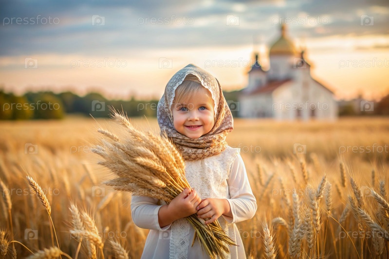 Русская девушка в белом платье и русском полотенце держит золотые колосья пшеницы на фоне созревающего поля и православной церкви