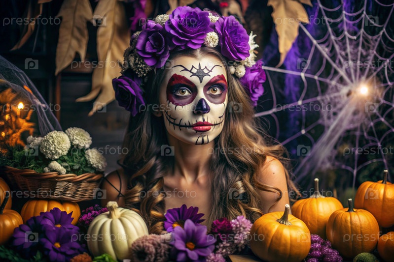 Концепция Хэллоуина. Ужасно. Костюмированная вечеринка. Красивая женщина с покрашенным черепом на лице и цветами на голове. Баннер, открытка