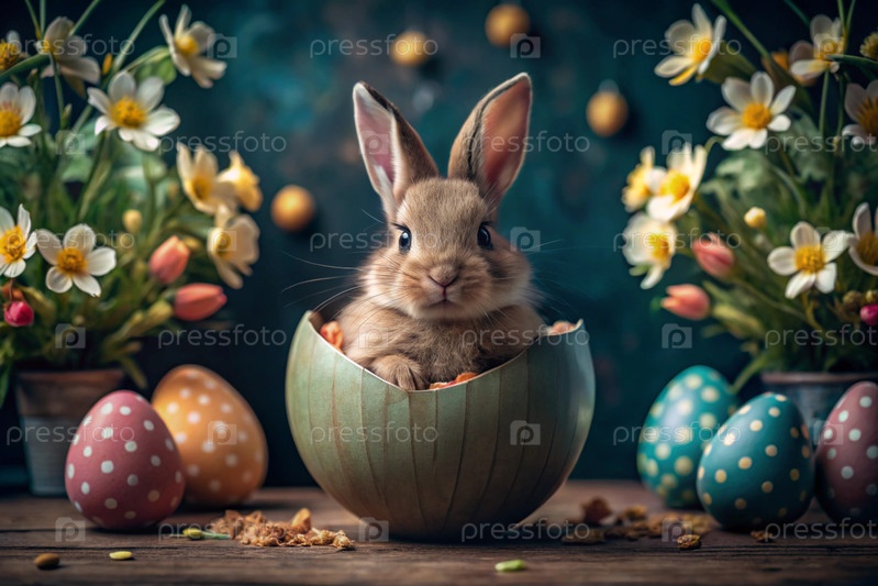 Известный праздник. милый пасхальный кролик заглядывает из пасхального яйца и разноцветные яйца разбросаны вокруг. концепция счастливой Пасхи