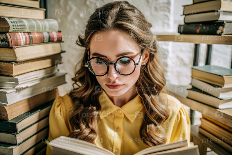 Чтение, подготовка к экзаменам. Прием в колледж. Молодая девушка с очками среди многих книг во внутренней части гостиной, сидящая дома под естественным светом
