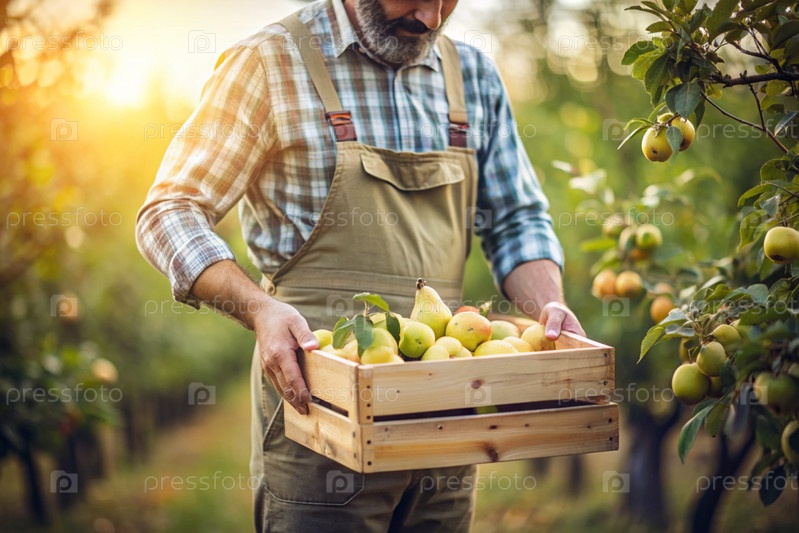 Сельскохозяйственная промышленность. Деревянный ящик с грушами в руках фермера-мужчины. Садовник собирает богатый урожай. Ближе, солнечный свет. Осенний сбор фруктов и овощей