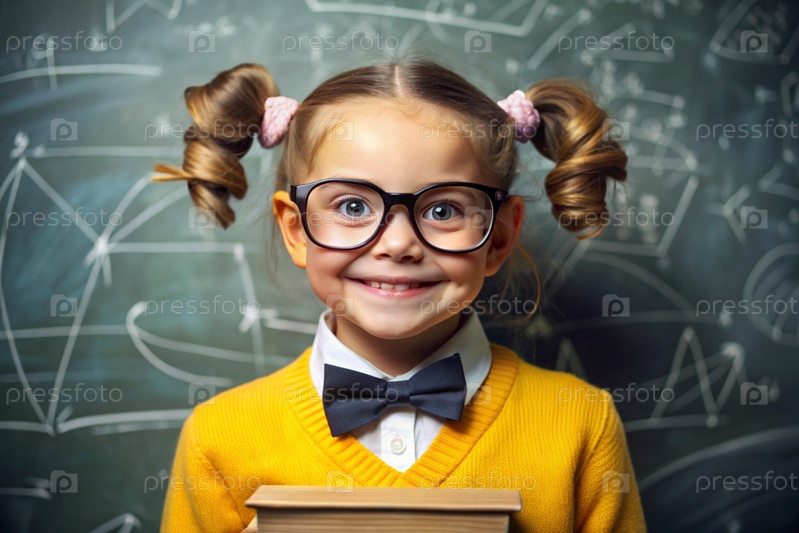 Милая, красивая первоклассница с очками. Букет цветов. Ребенок впервые идет в школу. Ребёнок с рюкзаком, книгой и цветами. Возвращение к школе