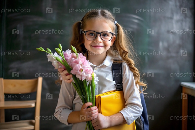 Милая, красивая первоклассница с очками. Букет цветов. Ребенок впервые идет в школу. Ребёнок с рюкзаком, книгой и цветами. Возвращение к школе