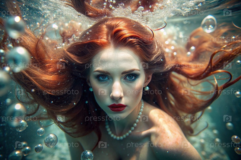 Портрет красивой рыжеволосой девушки в модном белом платье под водой на глубине