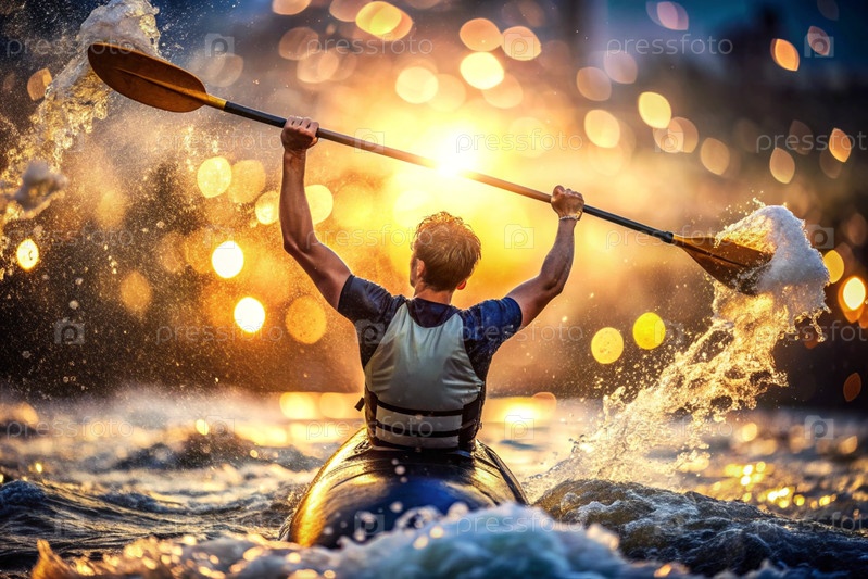 Каякер празднует свою победу с веслом в руках на размытом речном фоне