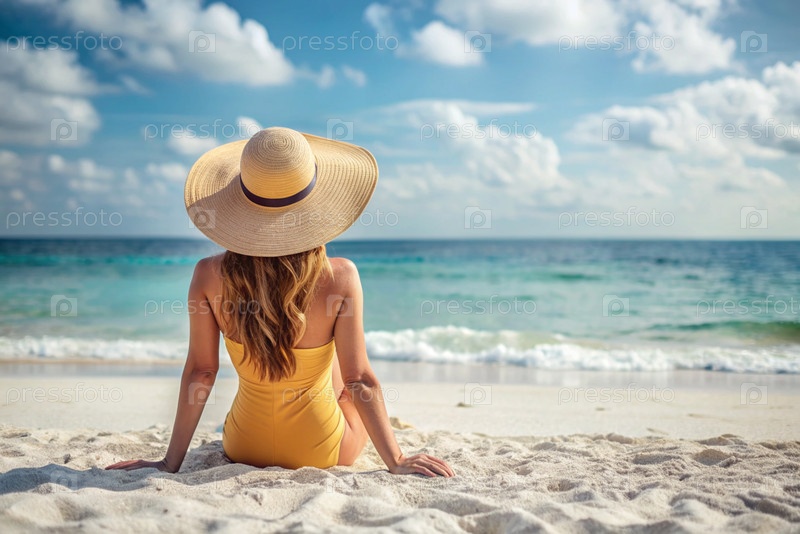 Женщина на отдыхе, сидящая в купальнике и соломенной шляпе с широкими краями на пляже в солнечный день и смотрящая на море