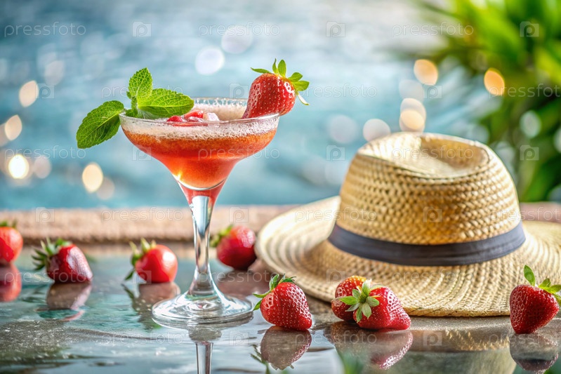 Стакан вкусной клубничной маргариты и клубничный коктейль на фоне бассейна. алкогольный коктейль сочного фруктового синего цвета с кубиками льда, ягодами и мятой
