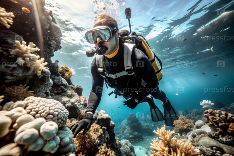 Свободный дайвер возле кораллового рифа. Скуба ныряет в гидрокостюме. Подводное погружение