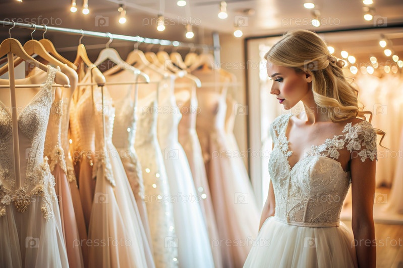 Аренда и покупка свадебных платьев для мероприятий. близко. красивая девушка Невесна пробует на себе элегантное белое свадебное платье в роскошном брачном салоне