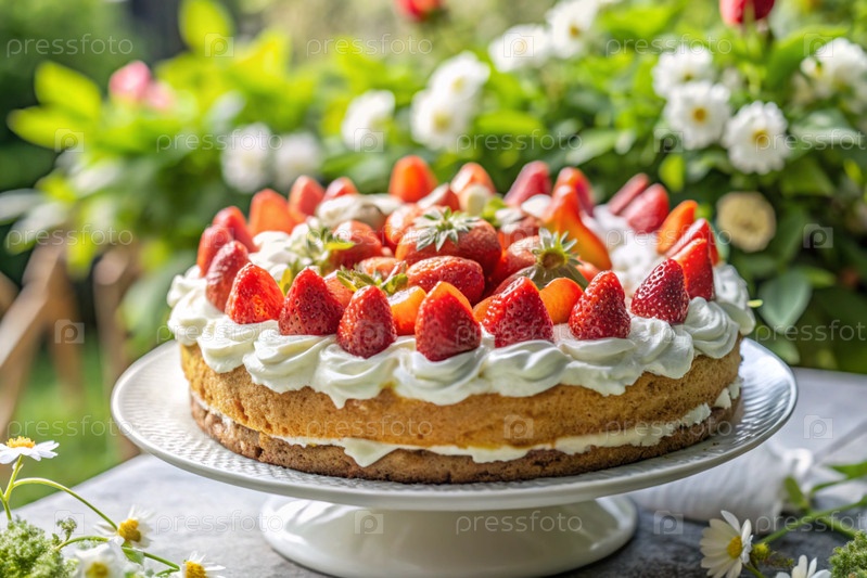 Концепция праздничных блюд. Красивый и вкусный домашний торт со свежими клубниками на столе в летнем саду. День рождения и сладости