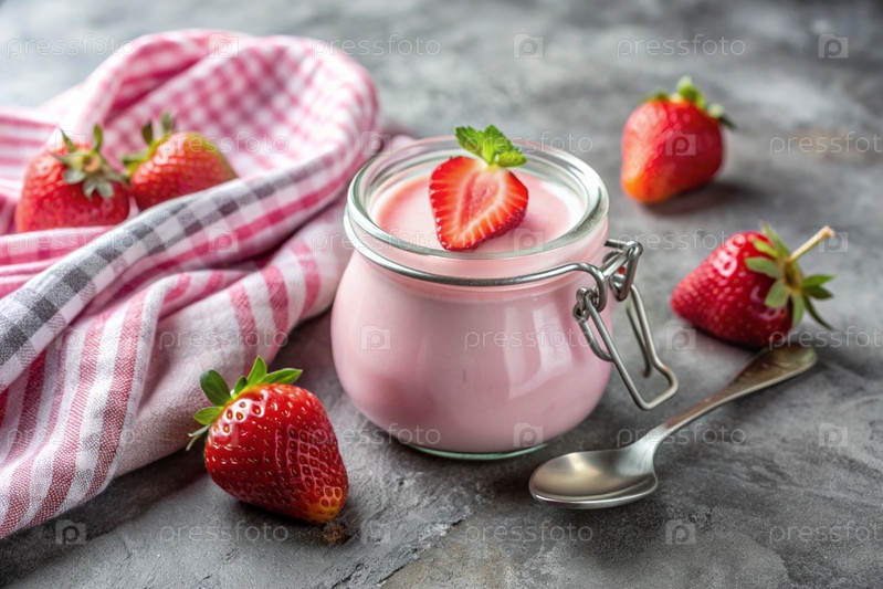 Домашний клубничный йогурт со свежими ягодами, винтажной ложкой и полотенцем на стильном сером фоне