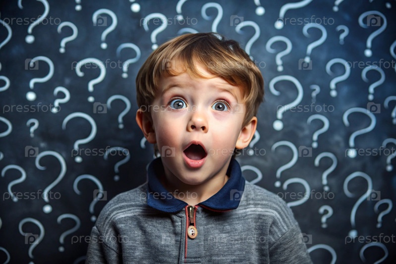 Развитие и образование детей. удивленный мальчик на темном фоне с вопросительными знаками. мозговой штурм, вопросы детей и концепция идеи