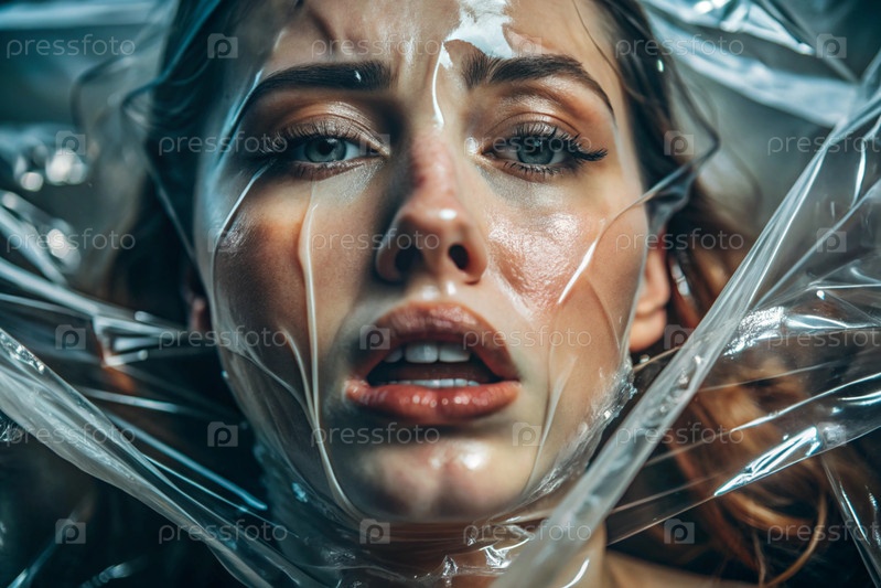 Девочка завернута в целлофан или сумку. Девушка задыхается. Пластиковое загрязнение планеты. Опасность для окружающей среды. Сокращение повторного использования пластика. Переработка. Концепция мусора