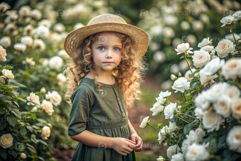 Портрет красивой кудрявой девушки в соломенной шляпе и платье в цветущем розовом саду. Детство. Девочка позирует и смотрит в камеру