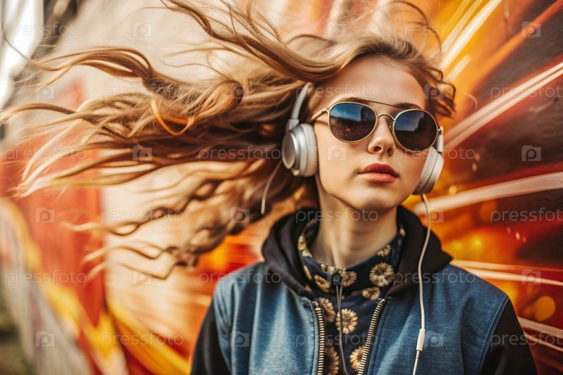Молодая красивая девушка с большими наушниками и солнцезащитными очками слушает музыку на ушах