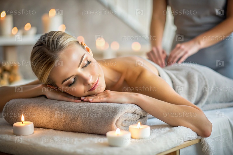 Баннер для профессиональных массажных салонов.Молодая, красивая блондинка наслаждается массажем в современном спа при свечах.Освобождение и гармония, уход за телом