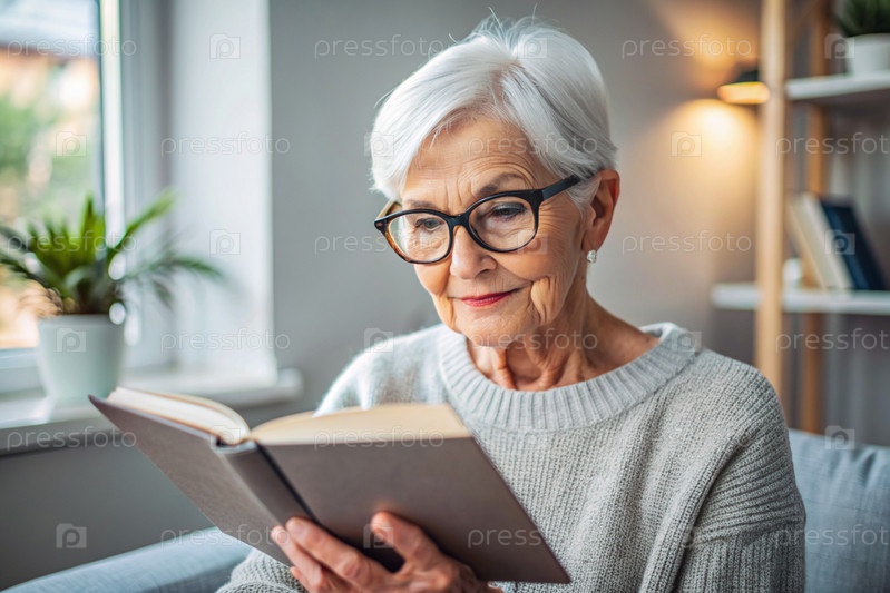 Пожилая пенсионерка, современная бабушка в очках, читает книгу во внутренней части гостиной, сидя на стуле дома при естественном свете