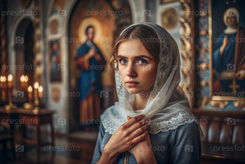 Портрет красивой молодой женщины с платками в православной церкви.Девушка молится в церкви среди икон