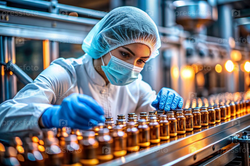 Производство лекарств: фармацевт тестирует медицинские флаконы на автоматическом трубопроводе фармацевтической производственной линии с использованием искусственного интеллекта