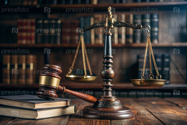 Древесный молоток, книги и весы на столе