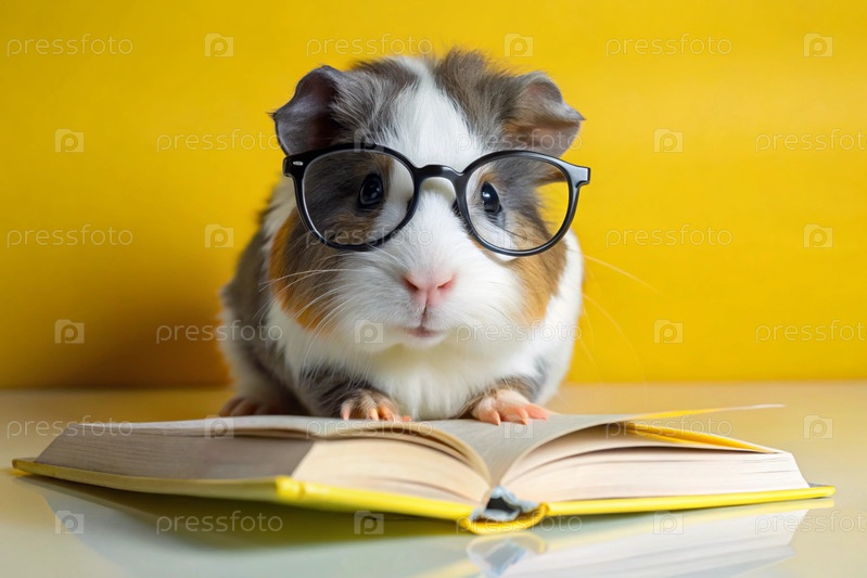 Забавная маленькая морская свинка в круглых очках читает книгу на желтом фоне