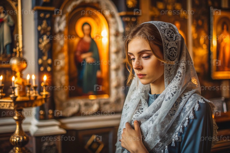 Портрет красивой молодой женщины с платками в православной церкви.Девушка молится в церкви среди икон