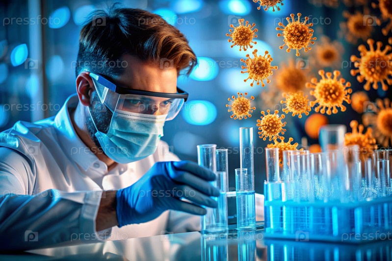 Ученый в лабораторном пальто и защитной маске осматривает трубки с светящимся вирусом в лаборатории, что символизирует продолжающуюся борьбу с инфекционными заболеваниями, важность исследований и изобретений вакцин