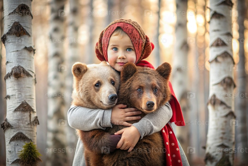 Красивая маленькая девочка в русской народной одежде и с платками на голове в березовой роще с живым медведем Русский фольклор, славянская мифология